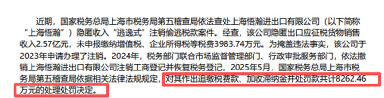 经官方机构调查,上海悟瀚累计隐匿出口应征税货物销售收入2.57亿元,未申报缴纳增值税、企业所得税等税款总计3983.74万元。