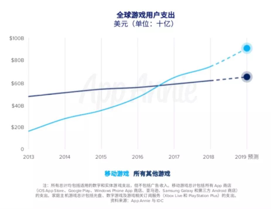 根据 App Annie 的数据,仅 2018 年,移动游戏就占到应用商店消费总支出的 74%,成为整个游戏市场上增长最快的一大领域。根据 Newzoo 的数据,移动游戏在 2018 年的收入高达 703 亿美元,占全球游戏市场总收入的 51%,远超 PC 游戏和主机游戏。App Annie 预测,移动游戏将持续增长,并于 2019 年年底,占到消费者全平台游戏总支出的 60%。
