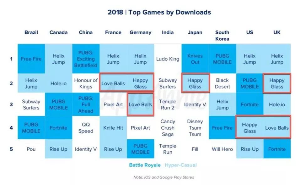 2018 年,Voodoo 凭借多款超休闲游戏(比如《纸片大作战 2》、《割草大作战》和《球跳塔》等)被冠以小游戏之王。截至撰稿时,这几款休闲游戏仍居 App Store 免费游戏的前 12 位。Lion Studios 亦凭借《恋爱球球》和《快乐玻璃杯》等休闲游戏大红大紫。根据 App Annie 的数据,2018 年全球移动游戏下载排行榜上,《恋爱球球》排名第 6 位,《快乐玻璃杯》则排第 8 位。