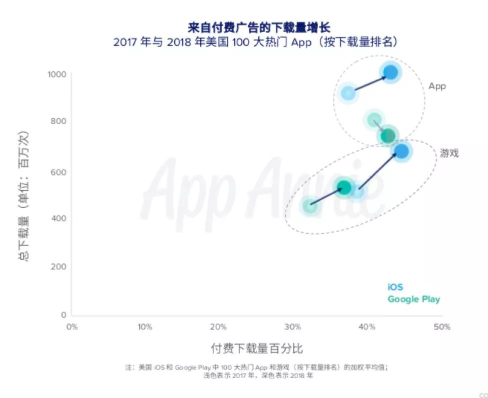 鉴于游戏市场已经饱和,付费广告相比以往变的更加重要。在 Android 和 iOS 平台上,付费广告所带来的下载量大幅增长。
