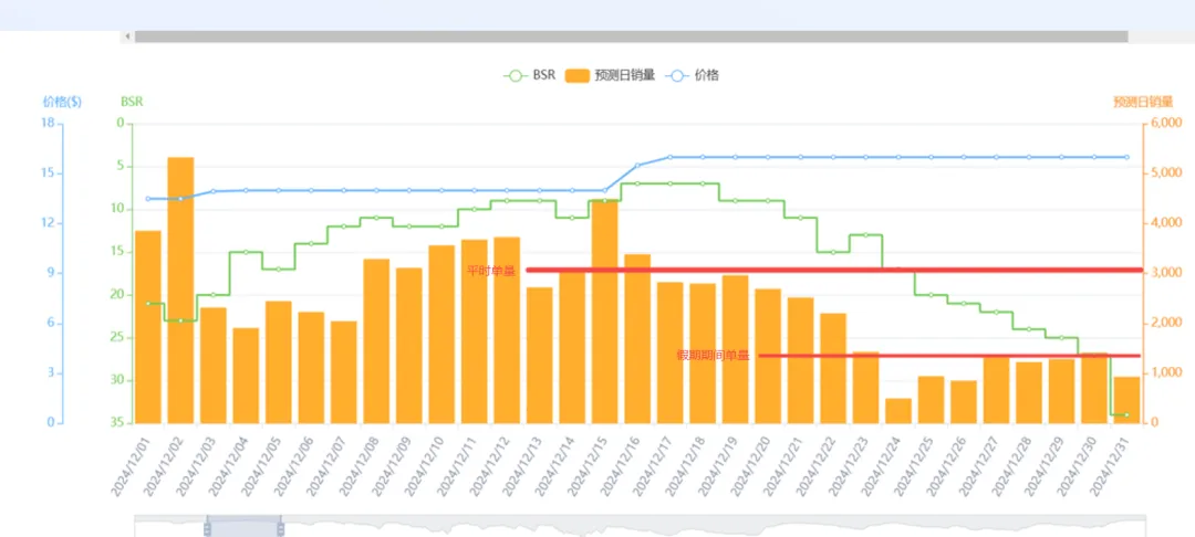 第3个方法参考BS去年同期变化数据。比如使用卖家精灵工具查看BS去年12月份每天的单量变化情况: