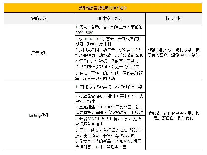 新品假期运营核心是 “轻量铺垫、蓄势节后”:广告精准小额投放,以自动广告跑词 + 少量核心词手动投放控成本,借小额优惠券促转化;