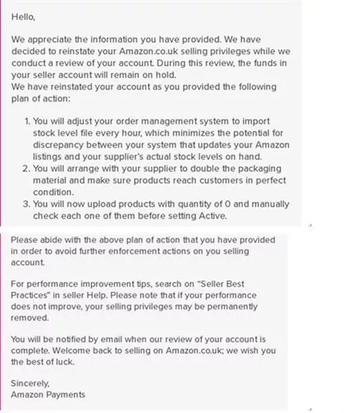 有些通知会要求卖家在特定时间内回复,一些通知甚至包含了提示,告诉卖家应该要怎么做。有时候他们会要求卖家找到导致账户冻结的投诉,并且制定相应措施,以防止未来再出现相关问题。