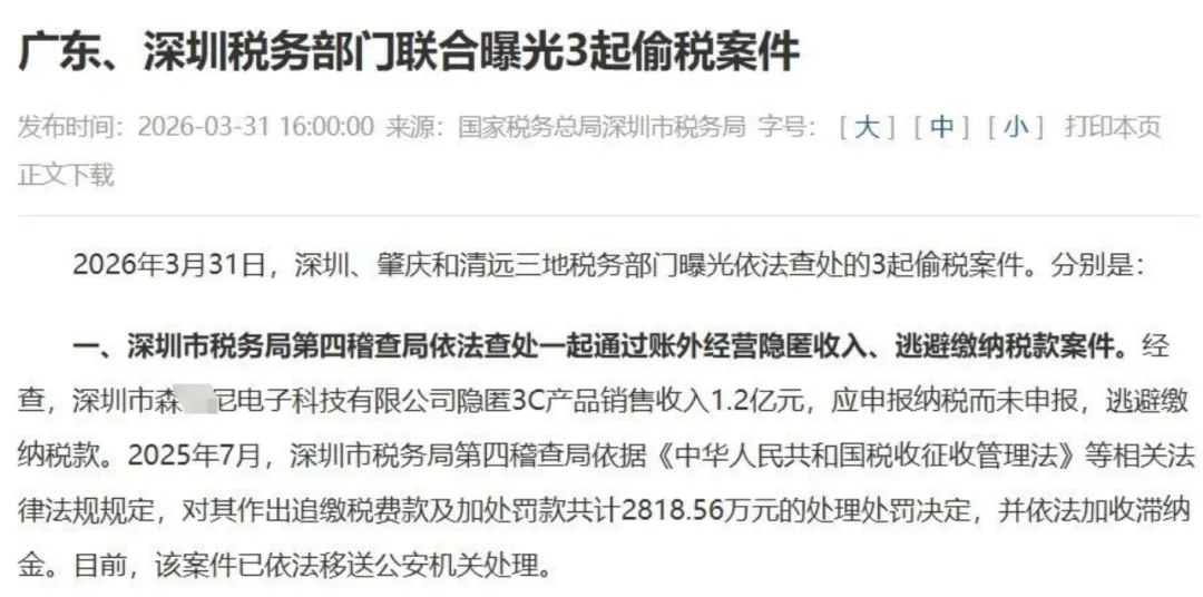 2026年3月31日,深圳市税务局通报深圳某电子科技有限公司通过账外经营、私人账户收款等方式,在2020至2022年隐匿3C产品销售收入1.2亿元,未申报纳税。经稽查核实,税务机关追缴税款、罚款及滞纳金合计2818.56万元,案件因偷税数额巨大已移送公安机关处理。