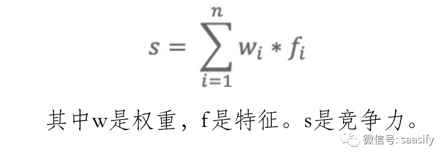一条广告可能被系统抽出许许多多的特征,比如:广告素材文字的内容质量,广告视频的长度,广告视频的清晰度,广告的转发数量,广告的点赞数量,甚至广告主页的历史表现等等等等。然后这些特征每一个对于广告系统来说重要程度可能都是不同的,比如广告的转发数量的重要程度肯定大于广告的点赞,也就是说转发的权重要大于点赞的权重。上面公式说的就是广告的竞争力等于特征权重的求和。