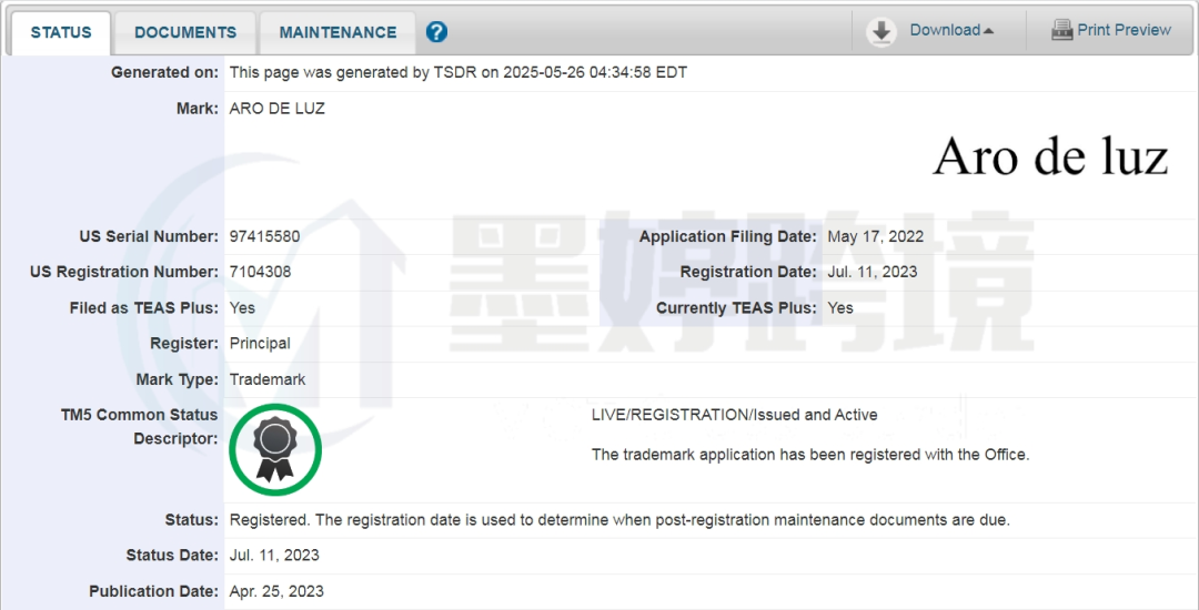虽然名称本身是通用词,但作为商标注册后,一旦被用于特定品类销售,就可能触发侵权风险。这意味着,如果跨境卖家在产品页面、包装或Listing标题中使用了“Aro de luz”作为商品描述,可能被列入维权范围,甚至遭遇TRO冻结资金。