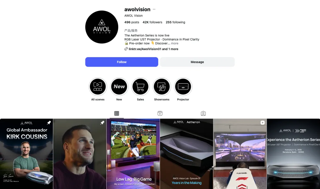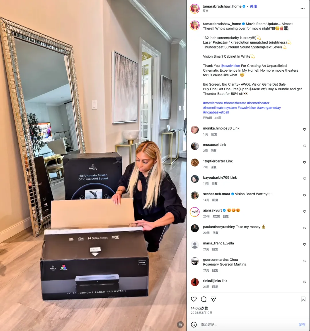 在合作形式上,AWOL Vision喜欢将产品自然嵌入到其家庭生活与观赛场景之中。相关内容更多强调“真实使用体验”,而非参数讲解,例如在家庭客厅中观看比赛、日常娱乐等场景下展示激光电视的大屏优势。