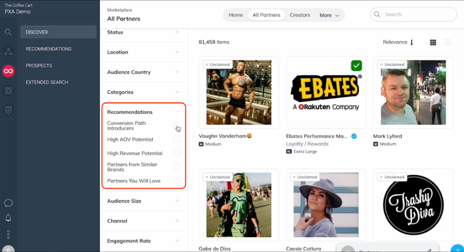 定位最合适的营销伙伴。得益于平台强大的数据追踪技术和算法网络,品牌可以利用「Recommendations」智能推荐功能从海量的资源库中选择最适合品牌的营销推广伙伴。