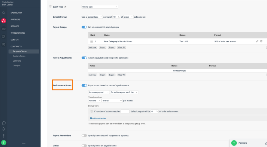 灵活定制合同。Contracts板块支持合同模板个性化定制,品牌可以基于营销伙伴带来的任一转化进行激励,支付条件支持按照不同SKU、国家、终端类型、流量来源等来设置相应规则,还可以根据绩效达成情况按梯度设置奖金。