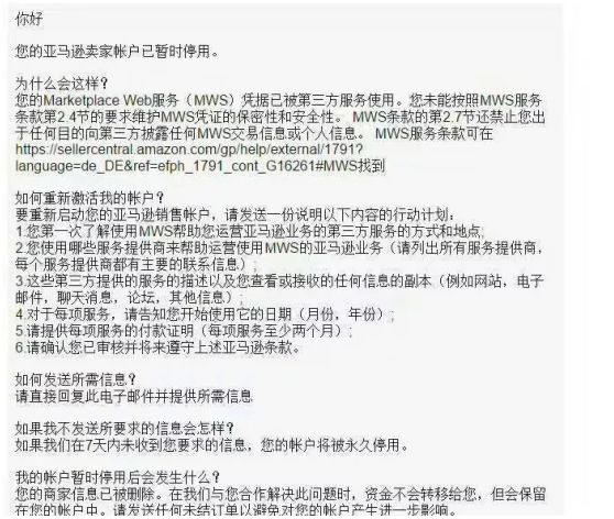 基于这两条,亚马逊的意思应该是,卖家把自己的MWS事务信息及个人信息披露给了不知名的第三方,导致MWS证书安全和保密性不复存在,被认为是交易信息的泄露源。