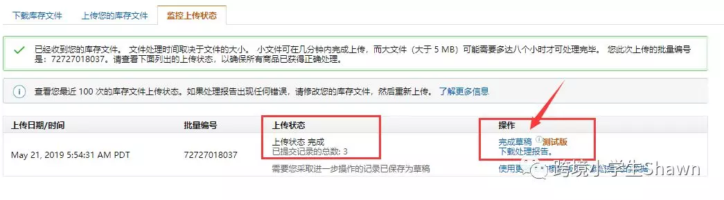6.检查批量文档:在产品上传完成后会出现一个结果,上传状态如显示“完成草稿”,则表示表格上传有报错,可以用下载处理报告看报错原因,再对错误进行改写;上传状态如显示“完成”,则表示模版上传成功。如果是实在是不懂哪里有错误,可以开case询问客服,以电话沟通的方式处理效率会更高。