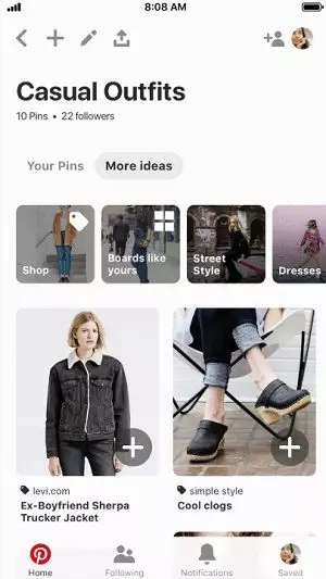 Pinterest一直以来都强调自己不能完全算个社交平台,因为它的建立不是只为了“聊天”,而是基于视觉搜索,供人们发布、搜寻和保存自己喜爱内容/产品的平台~ 并且Pinterest的图片展现形式是瀑布流式,不用用户翻页,展示全面又方便 (见下图)~