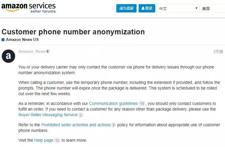 以下是亚马逊在美国站卖家论坛的亚马逊新闻(Amazon News US)版块发布的名为“匿名客户电话系统”(customer phone number anonymization)的公告帖: