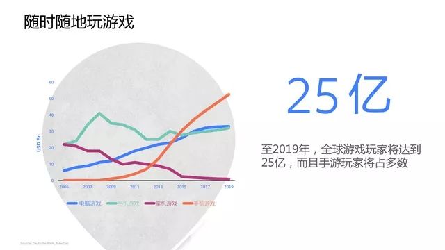 预估到2019年,全球玩家人数将达到25亿,就是说3个人里面就有一个人玩游戏,其中手游增长势头继续强劲,市场潜力不容忽视。