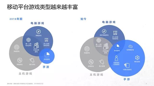 另外,移动平台游戏类型会越来越丰富。2010年阶段,手游仍处于休闲游戏为主的阶段。主机游戏上的是格斗游戏、竞速游戏、及第一人称射击等重度刺激游戏。PC端则有多人线上RPG、第一人称射击游戏与策略游戏。当时的手游设计太简单,缺乏中重度玩家追随的游戏逼真感。可是近几年来,专门为手机端开发的社交博弈游戏、策略游戏与轻度RPG游戏逐渐流行起来。随着新的玩法和对战模式推出,加上手游本身的社交属性,部分高付费率的RPG玩家因而将时间与花费转移到手游,当中比较成功的例子有腾讯的《王者荣耀》、《绝地求生》和IGG的《王国纪元》,手游发展让我们拭目以待。