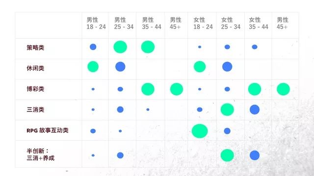 无论是什么类型的游戏,清晰定位是成功关键。针对北美市场,策略类的大R主要是25-44岁的男性用户;休闲类的目标受众相对较广,没男女之分,但以年轻人为主;三消类主要是抓住年轻妈妈;博彩则是定位于中老年人。