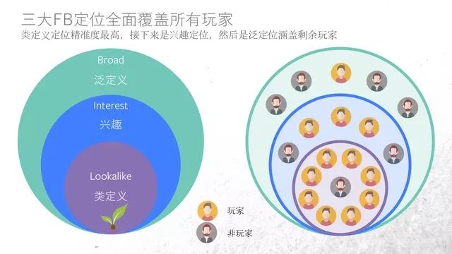 类定义定位 (Lookalike)精准度最高,因为是以核心用户的资料去做种子,再找出跟他们类似的用户。种子数量不用太多,建议是1000-10,000的高付费或者高活跃玩家。没有种子用户怎么办?不用担心,你可以使用兴趣定位 (Interest) 。除了一般兴趣爱好,你也可以定位游戏词组和热门游戏关注者。广告后台会有兴趣相关描述和用户规模预估,方便你去选择。泛定位 (Broad) 顾名思义是通过用户的基本信息,例如性别、年龄和所在地域去定位,精准度较低,主要是捞漏网之鱼,确保所有潜在玩家都捞进来。