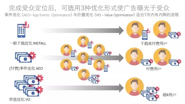 下载优化 (Install Optimization),系统对可能安装游戏的用户展示广告。这个是最基本的,适合所有应用推广。如果你的游戏7天内有内购,我会建议你使用进阶的应用事件优化 (App Event Optimization)。在AEO的世界里,系统把广告推送给有可能在游戏中完成某项事件,如购买,完成新手教学的人群,针对性明显,成效比一般下载优化更显著。最后,可以升级到价值优化(Value Optimization),系统针对游戏里面高价值用户进行优化,帮你找到大R,提高游戏营收能力。有很多广告主用了VO以后,收入得到很大的提升。