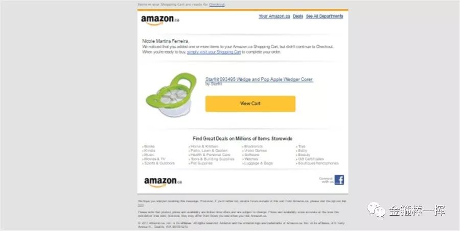 巨大的VIEW CART按钮、图片清晰提醒客户、三个链接可供客户点击到产品页面、email底部有其他产品列表,可供客户选择。