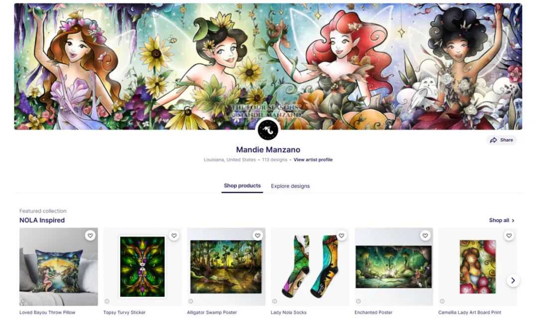 原告AMANDA MANZANO WAKILEH是一位常驻路易斯安那州的视觉艺术家,以笔名Mandie Manzano在自营网站、redbubble等平台创作和售卖她的作品。自2011年起,Mandie Manzano将丙烯颜料和墨水等传统技术与 iPad 等数字工具融为一体,形成她独特的创作风格。