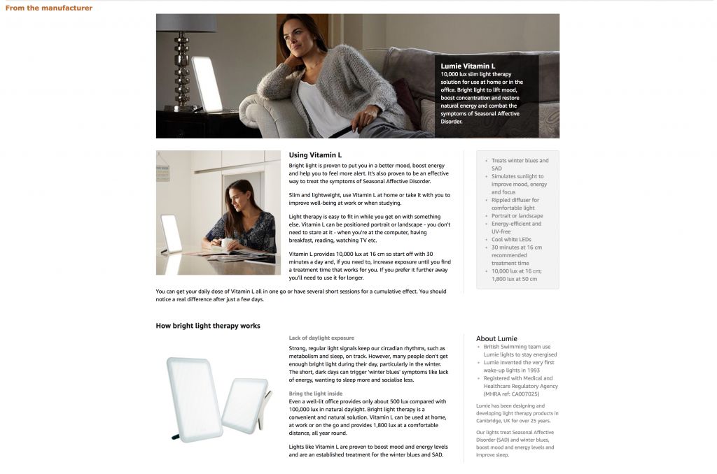 Verilux证明了,即使是老品牌也可以通过优化EBC listing来提高其在亚马逊上的转化率。Verilux制造日光灯,并注册了HappyLight商标。其在EBC listing中使用的信息图详细说明了产品优势、用途和功能,甚至概述了为什么消费者应该选择该特定模型,使每个商品都具有唯一性。