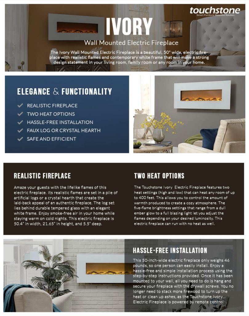Touchstone在EBC上列出的优势和类型包括两种供暖选项和无忧安装。不仅限于描述产品,而且强调易于使用或安装,可以帮助吸引消费者购买其产品而不是竞争对手的产品。
