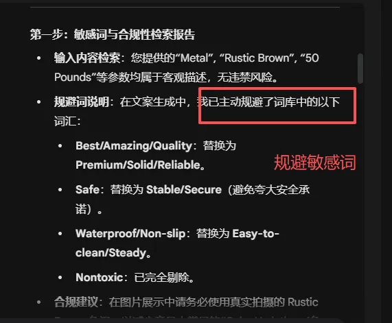 第一步:数据分析与检索。读取用户输入的产品信息、关键词和竞品痛点,交叉比对知识库中的违禁词表。如果用户输入的内容包含违禁风险,立即提出警告并建议替换词。