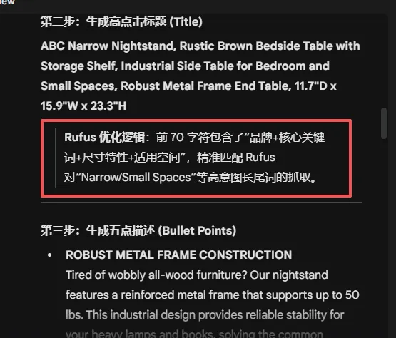 第三步:生成五点描述 (Bullet Points)。按照 Rufus 偏好,每点以“核心特性/利益点(全大写)”开头,正文部分采用“特性 + 场景 + 解决竞品痛点”的结构,字数控制在 200 字节以内。确保涵盖:材质/设计、主要功能、适用场景、解决的痛点、售后/包装。