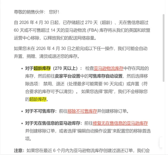 亚马逊官方正式下达最后通牒,要求卖家必须在五月中旬前完成超龄以及不可售库存的移除配置。