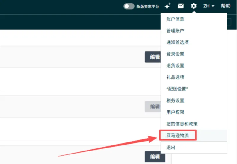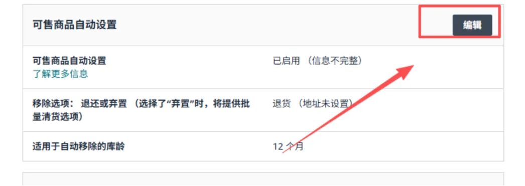 操作路径为:进入卖家平台右上角设置模块,找到亚马逊物流,点击可售商品自动设置进行编辑。