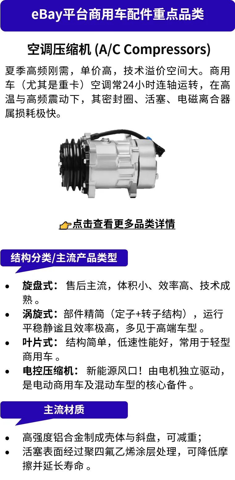 作为eBay 2026年汽配出海的战略方向之一,商用车赛道正加速爆发。该品类虽对专业度、供应链及运营服务要求更高,但其高客单价、高复购、低竞争的属性,正成为实力卖家实现差异化发展的重要方向。