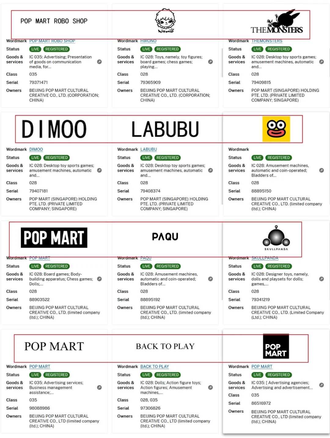 我们梳理一下LABUBU目前的注册商标就知道,现在泡泡玛特公司已经对自己的产品做了全方位的商标保护,可以说想要擦边其热门产品,几乎没有什么可乘之机。
