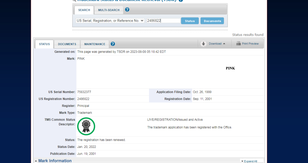 查询美国商标pink后,卖家发现,早在2001年,这一词语就已经被注册商标。因此,如今扫到卖家侵权,虽然是猝不及防,但是也确实有因可循。