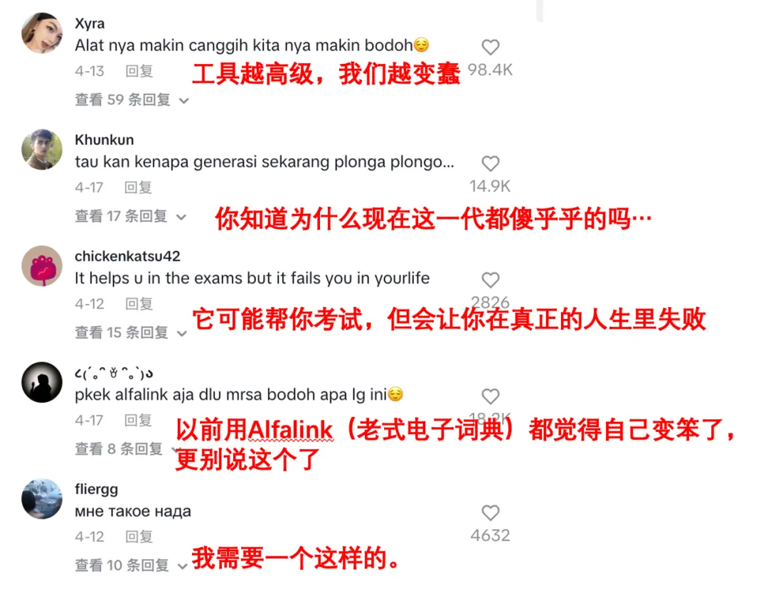 相比于视频里呈现出的考生面对考试难题的“从从容容”,评论区观众的心情好像要复杂得多。有人调侃“设备越高级,我们变越蠢”;有人暗示“现在这代人头脑空空并不是巧合”;也有人警告“它能帮你通过考试,却会害你输掉人生”。与此同时,仍不乏有人直言“我需要它”。从这些评论中也能体会出不同观众身份的所附带的视角差异,偏教育者以及家长的一派会对此类设备保持警惕,但对于学生来说,当纸笔考试重新回归、手机限制愈发严格时,任何能带来“不公平优势”的工具,反而显现出极强的吸引力。