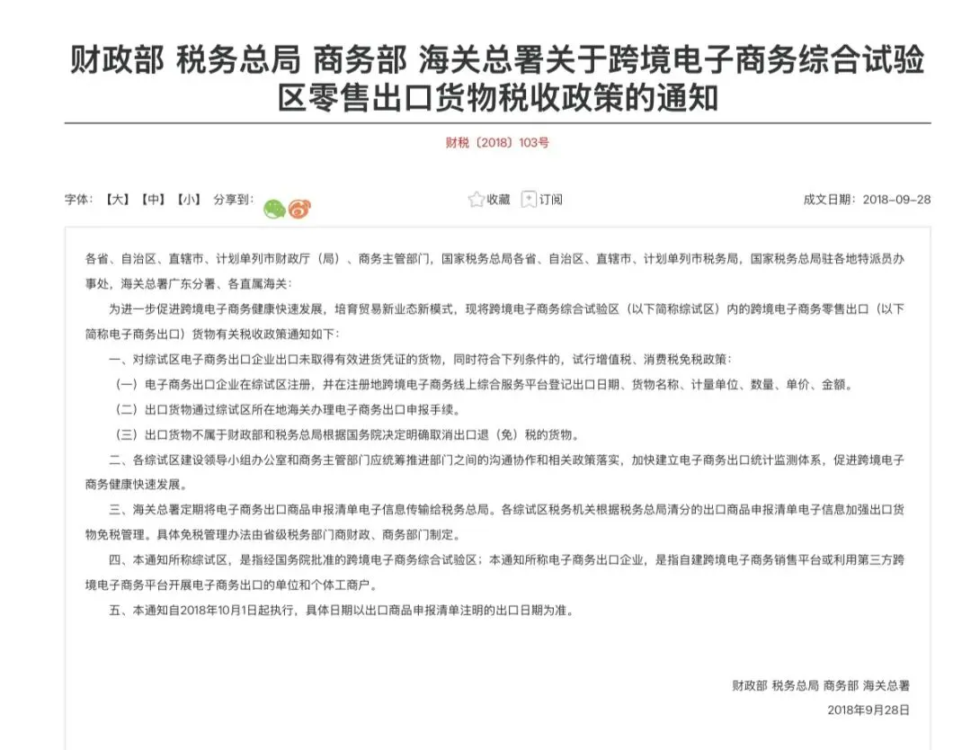 转机来自于一项国家层面的政策——《财政部 税务总局 商务部 海关总署关于跨境电子商务综合试验区零售出口货物税收政策的通知》(财税〔2018〕103号)。