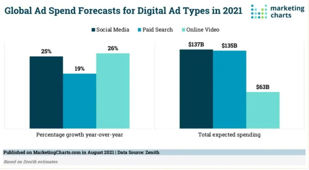 社交媒体广告支出预计将首次超过付费搜索,到 2021 年底增长 25%(根据营销图表对 Zenith 数据的解释)。