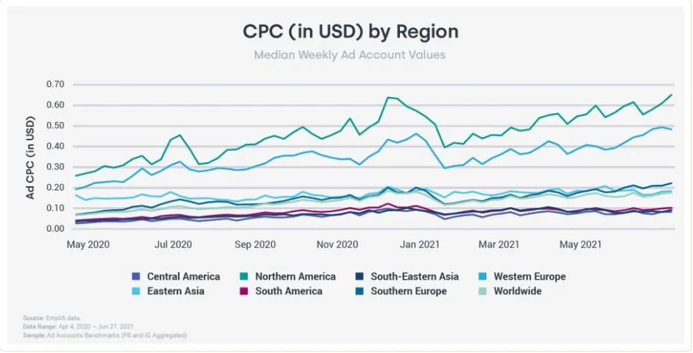 同样,您可以在 2020 年假期期间看到相当大的峰值,在北美达到每次点击 0.60 美元至 0.70 美元。但是,请注意,北美 CPC 在 2021 年前 6 个月稳步上升至历史新高。