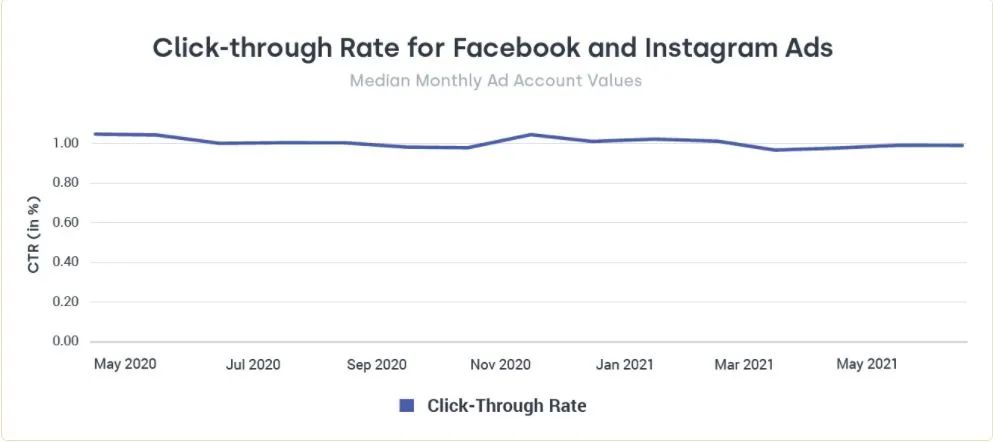 根据Sidecar的数据,2020 年零售 Facebook 广告的平均点击率为 1.32%,Instagram 为 0.58% 。