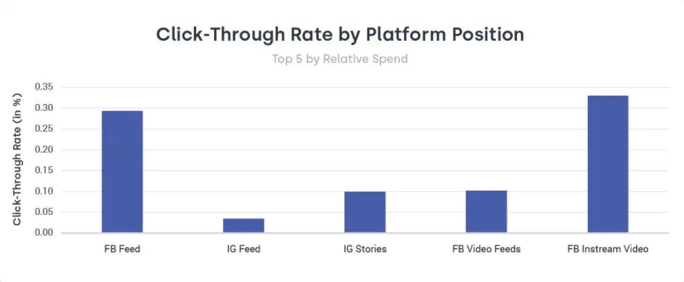 有趣的是,Facebook 的视频插播广告的点击率最高,为 0.33%,其次是 Facebook 动态广告,为 0.29%。Instagram 广告的点击率远远低于其点击率。
