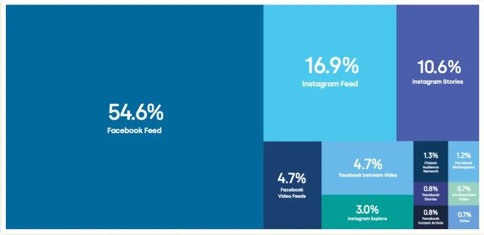 近 55% 的广告支出分配给 Facebook 订阅源。下面的图表提供了完整的细分。