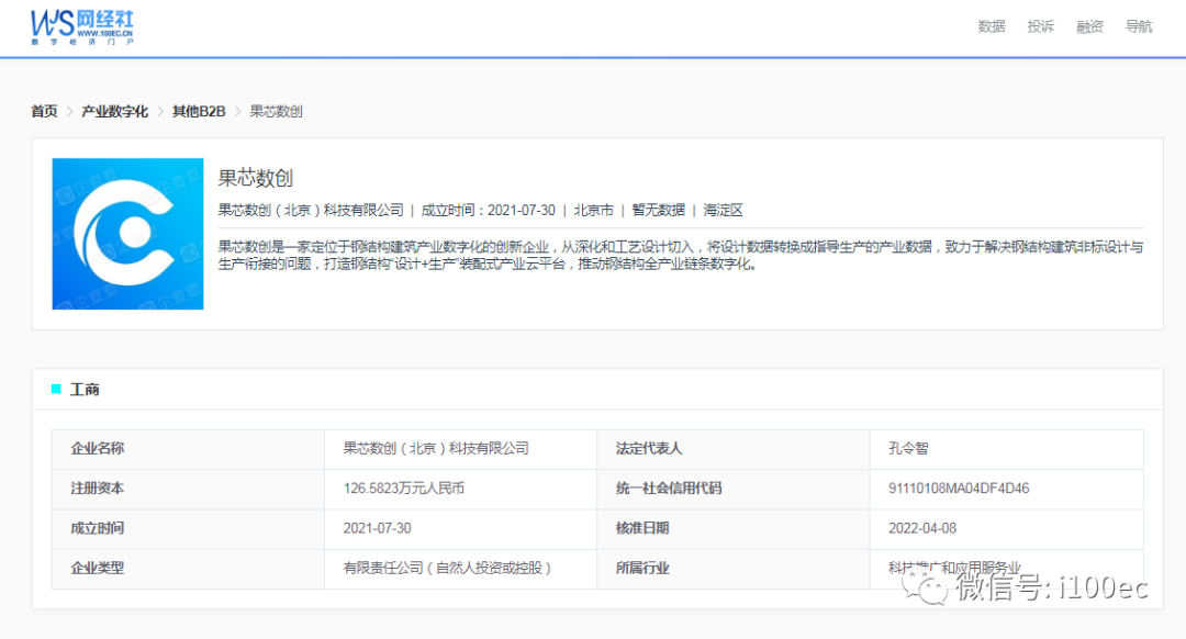 据网经社企业库(COP.100EC.CN)显示,果芯数创成立于2021年7月,法定代表人孔令智,企业名称为果芯数创(北京)科技有限公司,是一家定位于钢结构建筑产业数字化的创新企业,从深化和工艺设计切入,将设计数据转换成指导生产的产业数据,致力于解决钢结构建筑非标设计与生产衔接的问题,打造钢结构“设计+生产”装配式产业云平台,推动钢结构全产业链条数字化。
