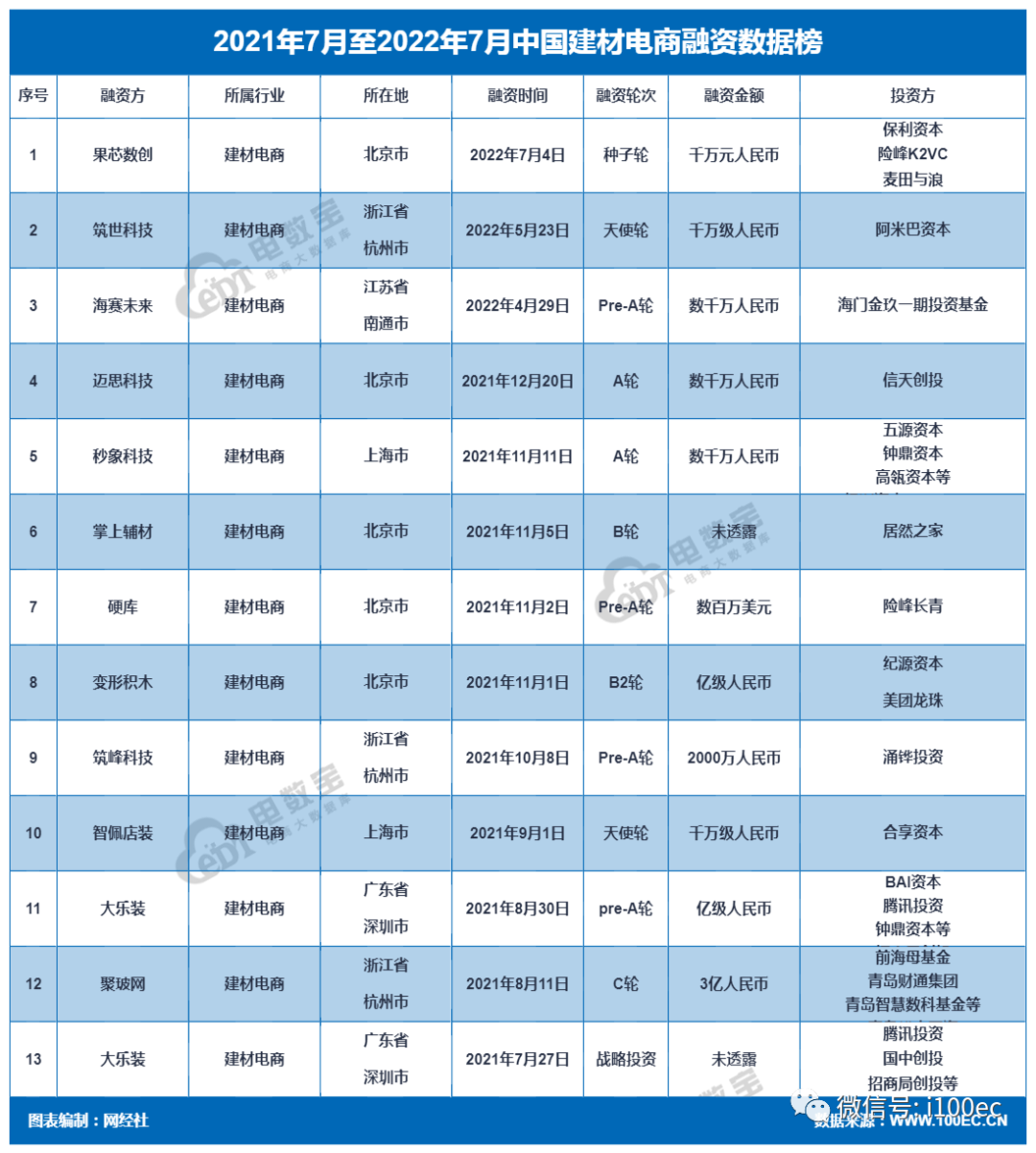 据“电数宝”电商大数据库(DATA.100EC.CN)显示,2021年7月至2022年7月,国内建材电商领域共发生了13起投融资事件,融资总额超6.2亿元。涉及的公司包括:果芯数创、筑世科技、海赛未来、迈思科技、秒象科技、掌上辅材、硬库、变形积木、筑峰科技、智佩店装、大乐装、聚玻网等。