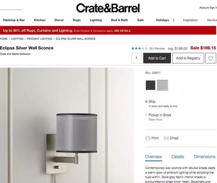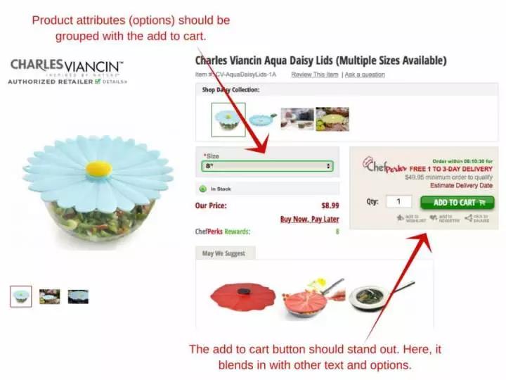 之前Crate&Barrel将CTA按钮放在产品图片和规格等信息之前,结果并不理想。CTA的定义是消费者在对产品有一定的兴趣后,呼吁采取行动。让消费者在还没查看产品之前就点击购买不太可能。