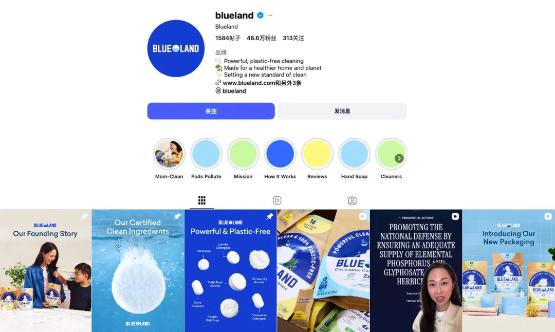 它的社媒运营思路非常聪明:绝不通过道德绑架来卖货,而是通过视觉美学和生活方式的展示,让用户觉得“用 Blueland 是一件很酷的事”。