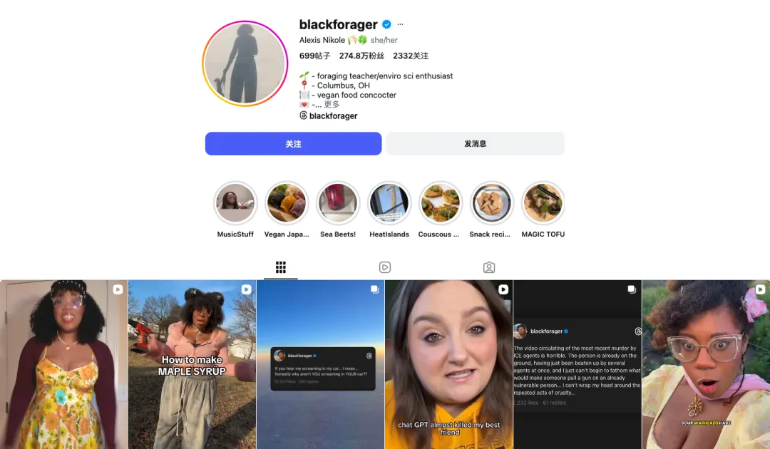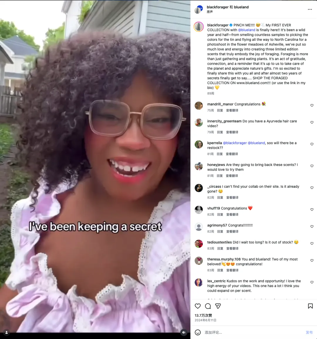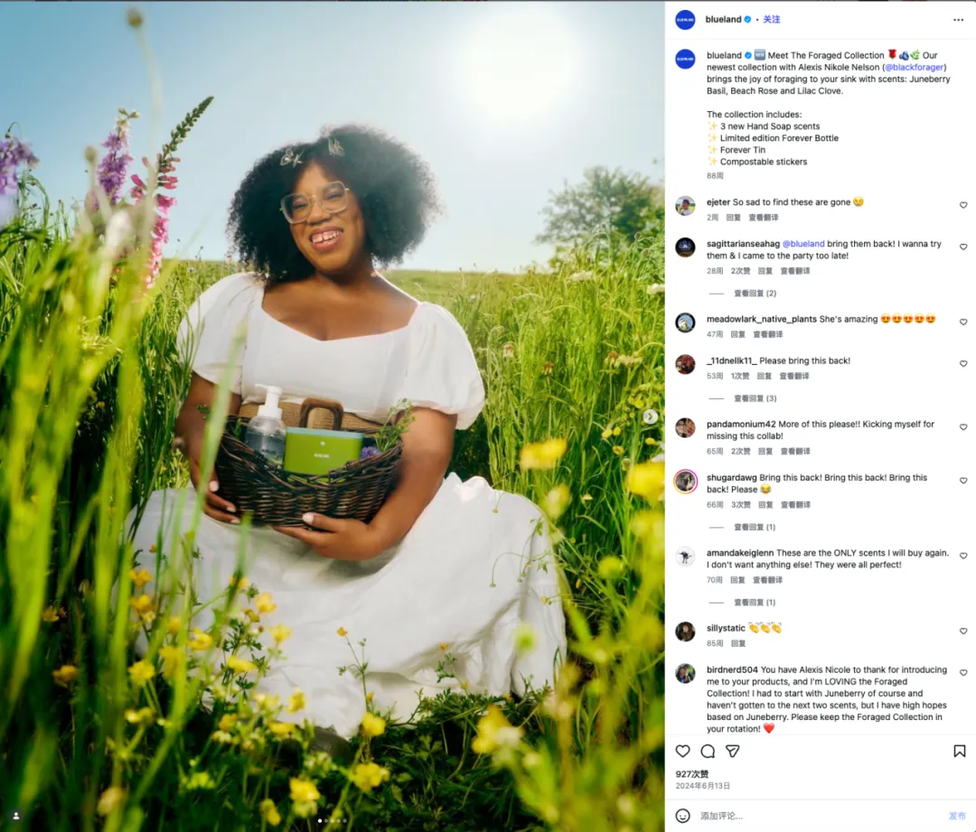 此外,在红人合作上,Blueland 的打法极具深度。最值得复盘的案例是它与“宝藏博主” Alexis Nikole Nelson(@blackforager) 的深度共创。