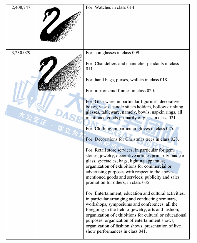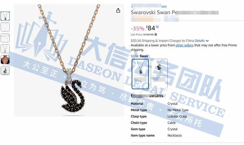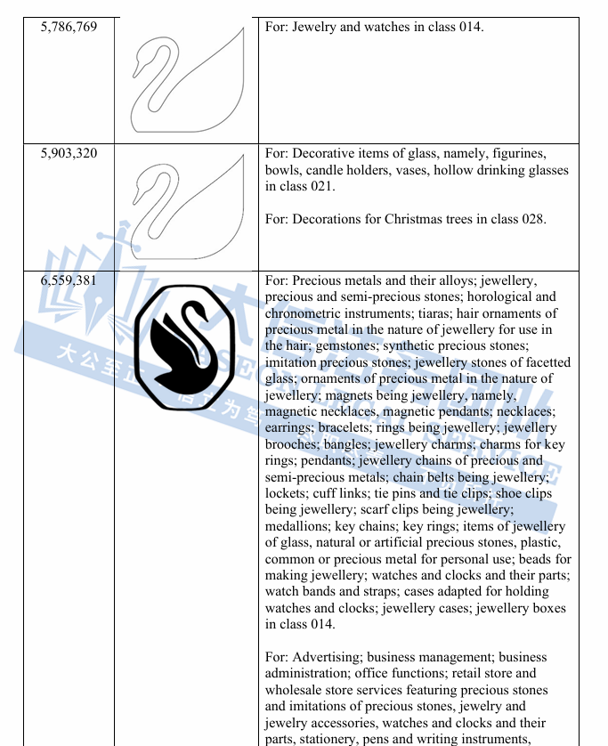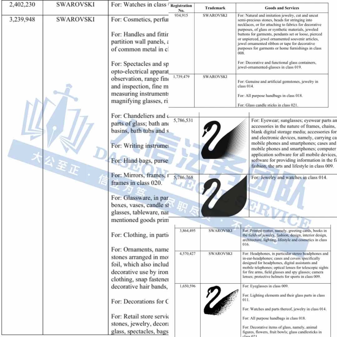 此案为商标维权,涉及多个文字商标以及Swarovski标志性天鹅图形商标,未经授权均不可擅自使用,侵权风险极高!以下是涉及商标的具体信息,跨境卖家尽快检索下架,否则会有TRO侵权风险!