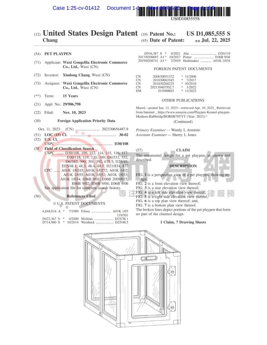 【侵权快讯】25-cv-1412 刚下证就维权专利+1!国人原告宠物围栏专利发案,宠物用品卖家速排查下架!