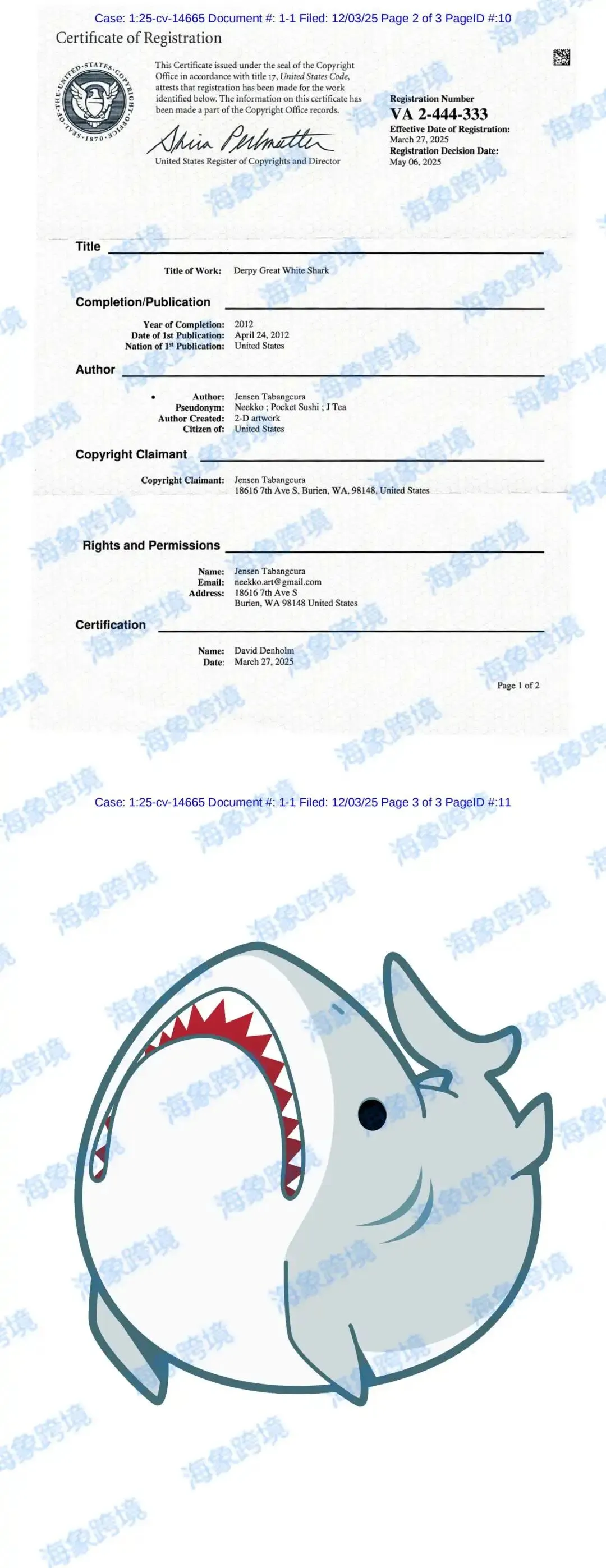 原告 Jensen Tabangcura 是一位艺术家。原告在夏威夷长大,并从该岛充满活力的文化以及书籍和电影中汲取了丰富的灵感。原告以 Neekko 的名义在线销售产品,以下鲨鱼插画未经允许不得使用!