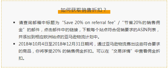 近期随着旺季的来临,一些卖家动作频发,我们经常听到跟卖,侵权,冻结账号等无利消息,徒添了许多烦恼。这次,亚马逊放出一个特大福利来拯救我们卖家啦!即日起至2018年12月31日,及时为亚马逊指定的符合要求的产品开启欧洲FBA,可享受 20% 的销售佣金折扣。你没听错,佣金打八折哟!!!