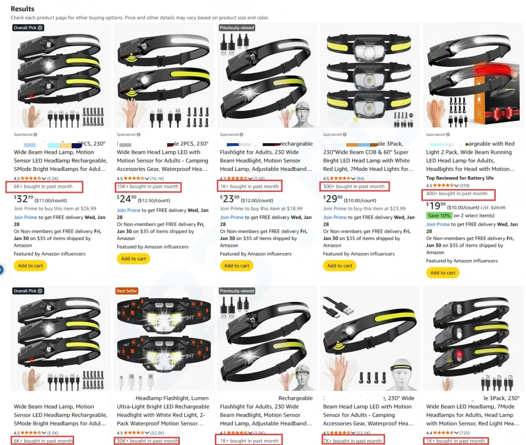 小编在亚马逊上,用专利的名称“HANDS-FREE HEADLAMP SYSTEM”搜过一遍,发现大部分的产品都和这种头戴式照明灯有关,月销量从700-30k不等